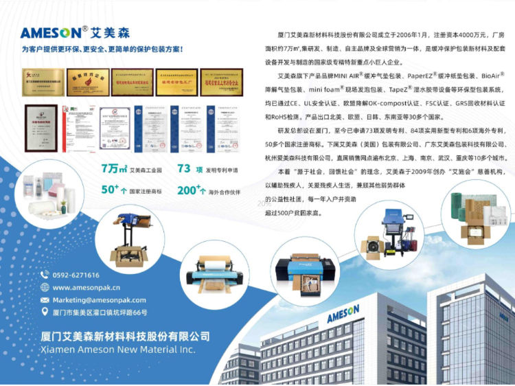 未来,厦门艾美森新材料科技股份有限公司将继续以创新为引擎,以环保为底色,与全球伙伴携手共进,共绘包装行业可持续发展的崭新蓝图。